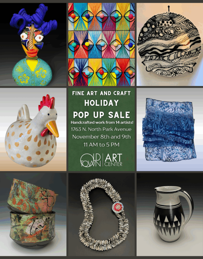 This pop-up event will feature 14 Chicago area artists showing handmade ceramics, glass, jewelry, sculpture, painting, and mixed media. Each artist will be present to sell their own work, with a portion of sales benefiting the Old Town Art Center. Admission is free and open to the public.