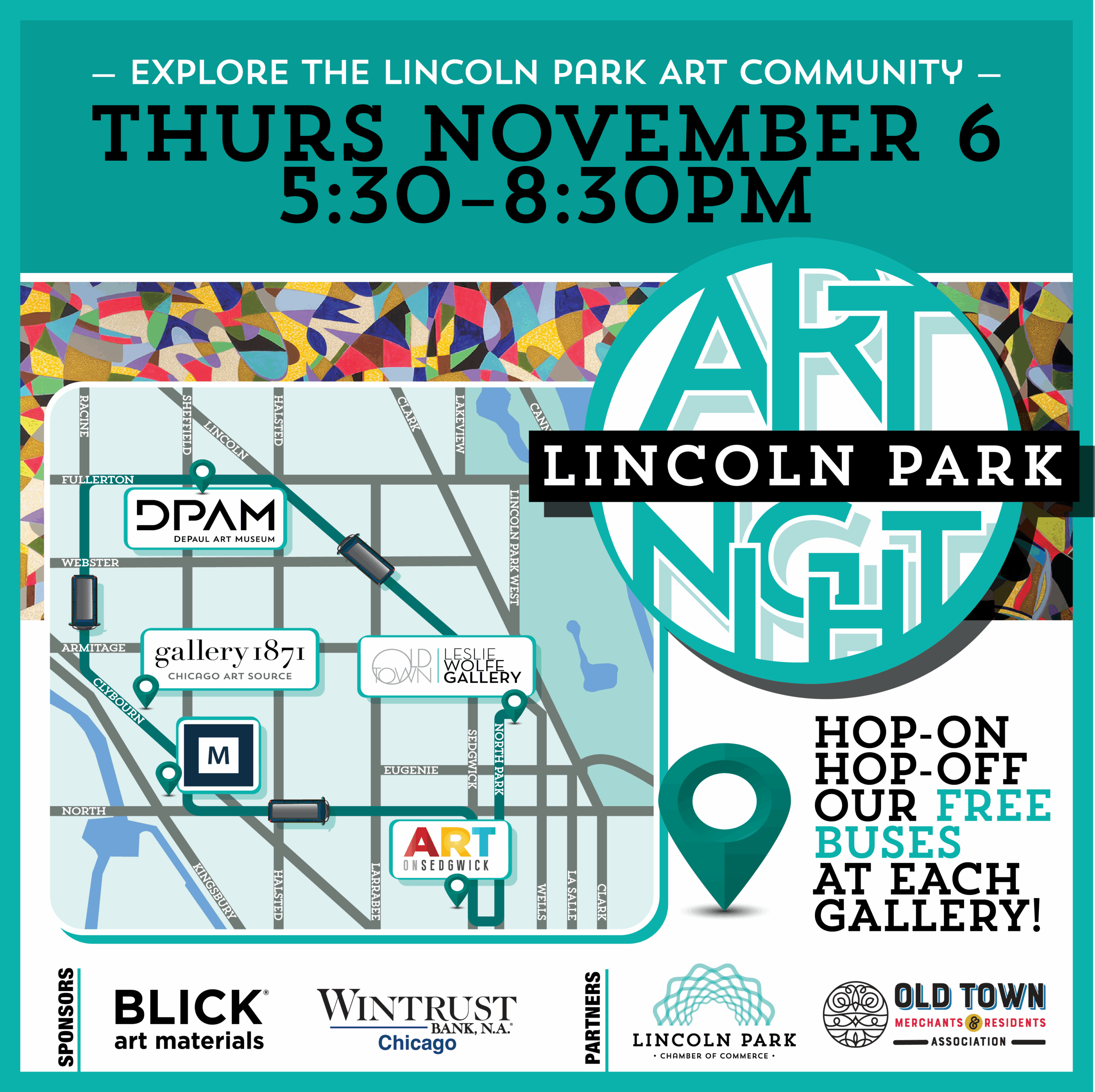 Enjoy the hop-on/hop-off vans that will loop the area all night long. Each venue will offer specials, food, beverage, music or artist lectures and tours.