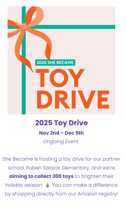 is located across the street from Walter Payton College Prep. Salazar is supported by our friends at She Became (see below). Salazar students come from low-income and temporary protected status families who may not be able to celebrate the holidays with the toys on their list this year. We are seeking gift cards to fulfill holiday wishes for the students; Amazon, Visa and Mastercard gift cards can be used anywhere.